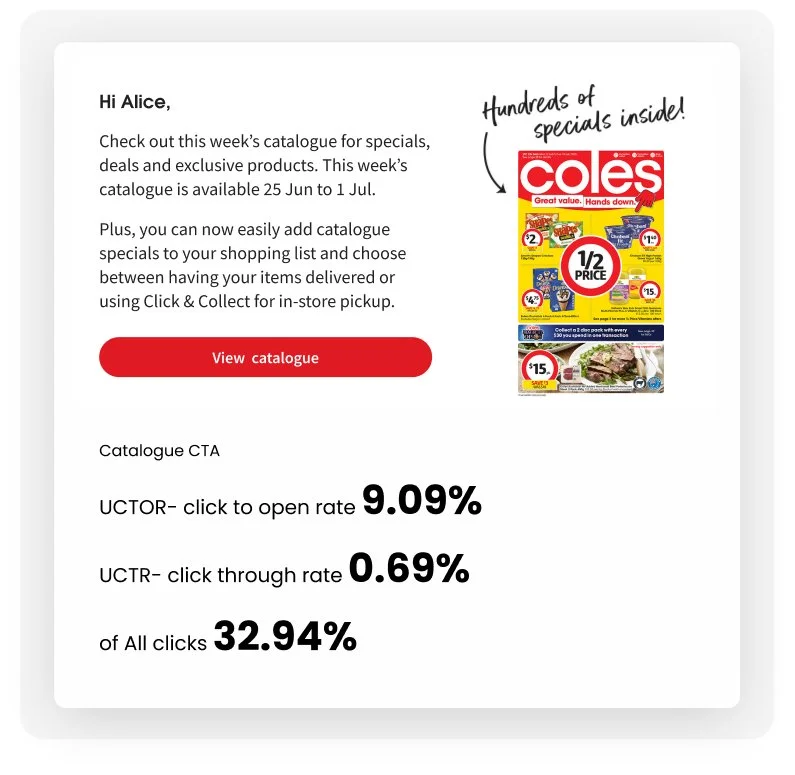 The personalised specials grid in the email engaged 101% more Coles subscribers to click-through, lifting this metric 51% above our benchmark (3.4% vs 2.2% 13-week average).