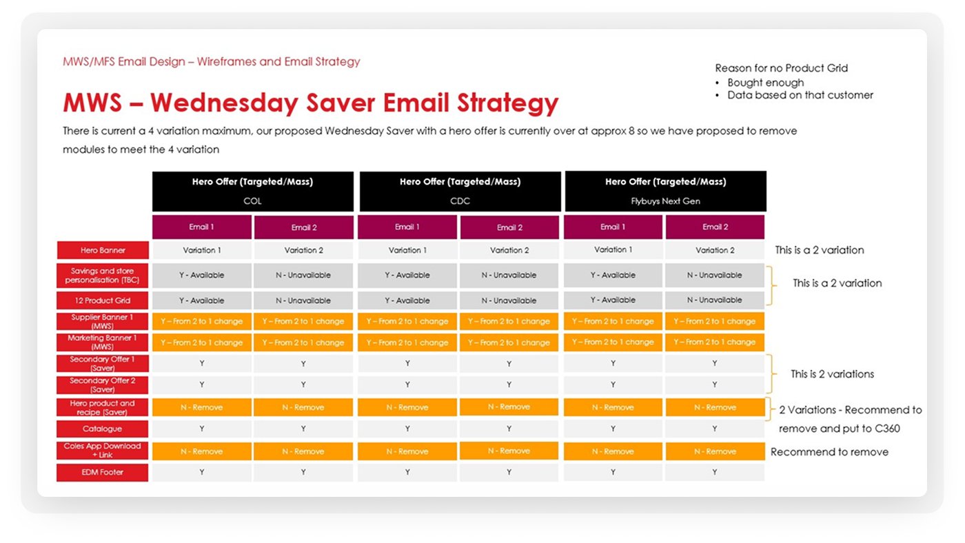 I shaped the vision for combining the Coles weekly Wednesday saver email and the Flybuys Coles specials for the week email together into one as Flybuys were no longer sending this email out to customers.